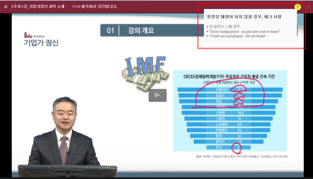 동영상 강의가 정상적으로 재생되지 않는다면 아래의 그림처럼 플레이어 상단의 노란색 물음표를 클릭하여 문제해결 방법을 도움받으시기 바랍니다.